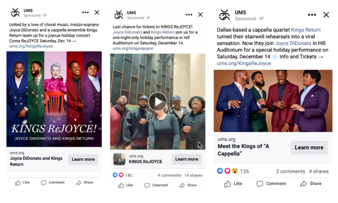 As a performing arts presenter, UMS is often beholden to what they can get from the artist—but they recognized the value and need here, and pushed to make this strategy work. Their willingness to ask directly and explicitly for the content they want to post (organically and in paid campaigns) enabled their success. If assets are limited, we encourage our clients to ask what’s possible for an artist to provide, even if they’ve heard their fair share of hard no’s in the past.